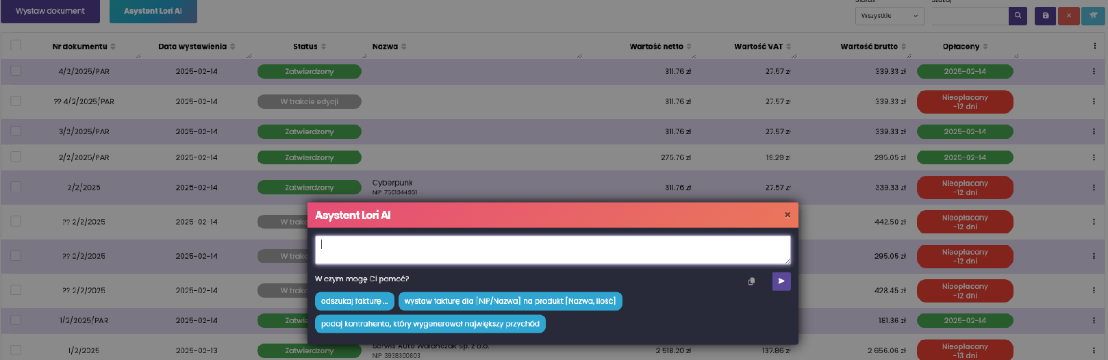 Klienci korzystający z przeglądarkowych wersji naszych aplikacji mogą w swojej codziennej pracy doświadczać pełni możliwości, jakie oferuje Asystent Lori AI - od zarządzania dokumentami handlowymi, poprzez obsługę zamówień, aż po zarządzanie stroną WWW i sklepem. Niżej przykładowe zadania, które można mu zlecić podczas codziennej pracy w programie: